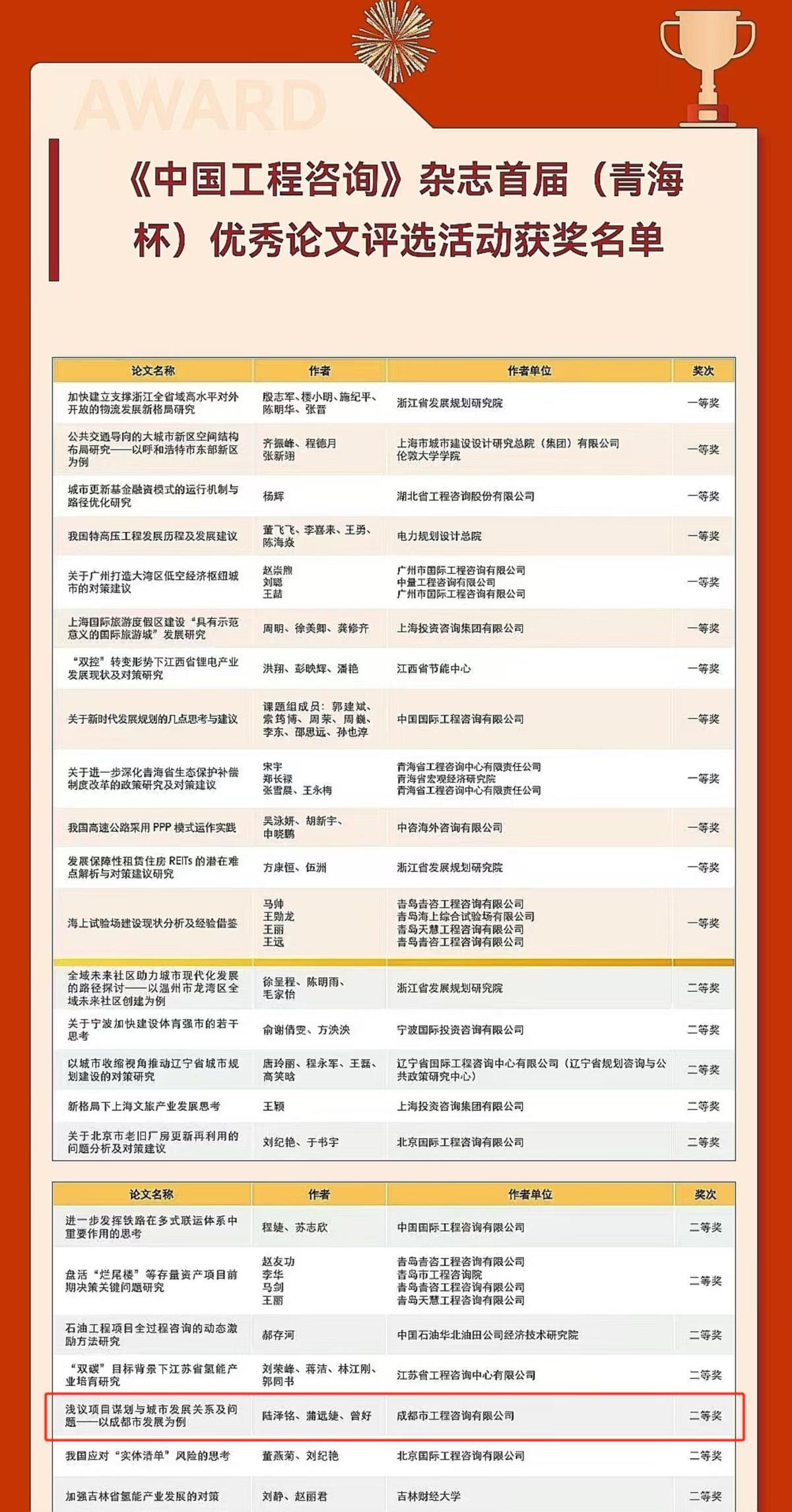 2024年8月7日,《中國工程咨詢》雜志首屆(青海杯)優(yōu)秀論文評選結(jié)果揭曉。成咨公司規(guī)劃與政策咨詢事業(yè)部陸澤銘、蒲遠婕、曾好發(fā)表在2023年第11期的《淺議項目謀劃與城市發(fā)展關系及問題——以成都市發(fā)展為例》一文在激烈的競爭中脫穎而出,成功獲得本屆優(yōu)秀論文評選二等獎。